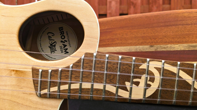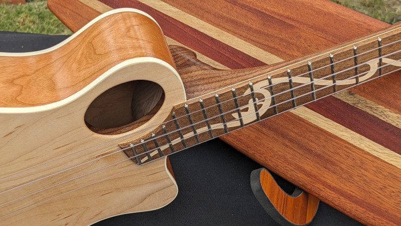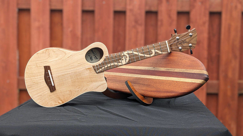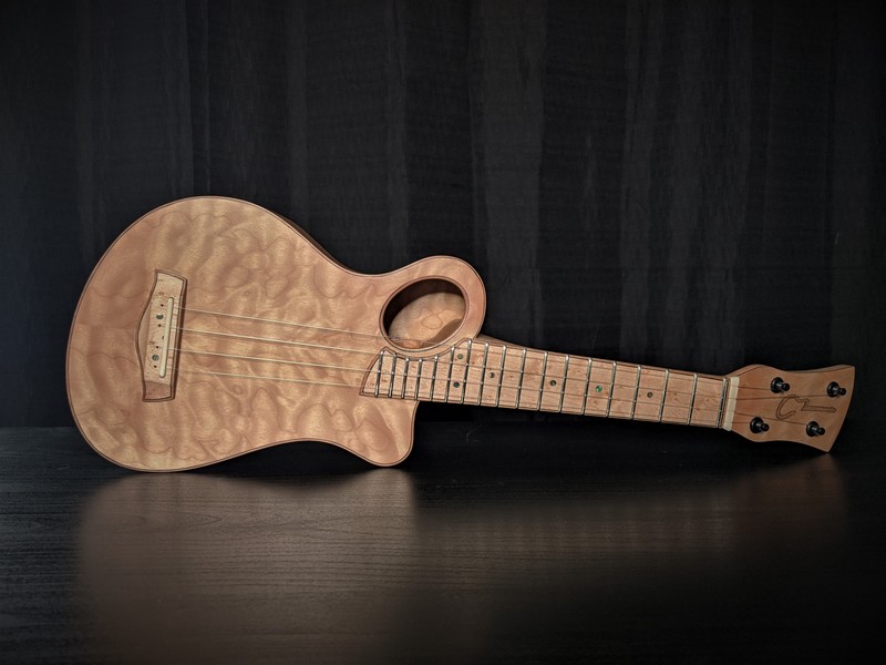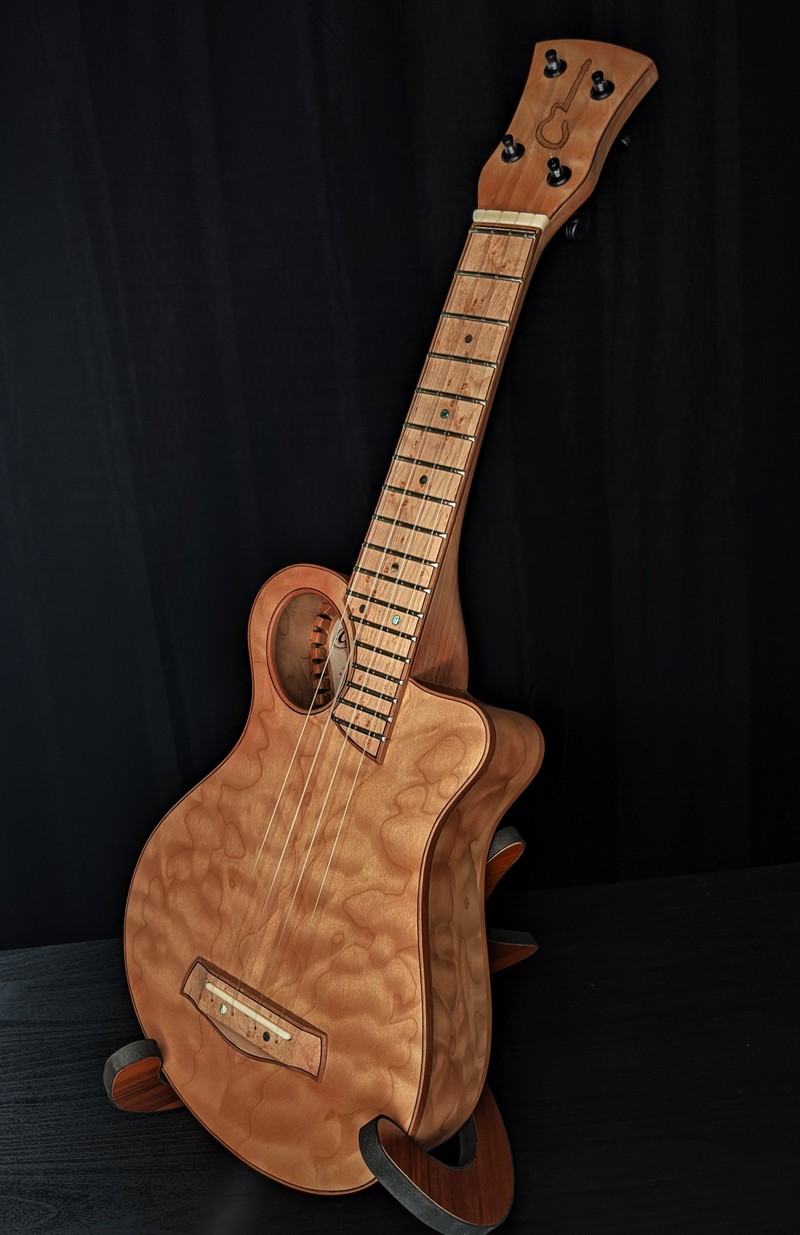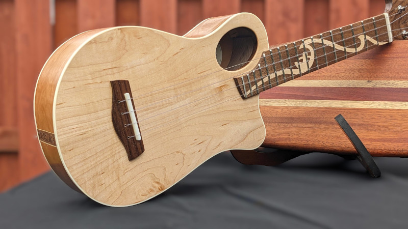 The Grover Beach Custom was a special build in the CalStyle workshop because it was our first custom commissioned CalStyle instrument. The client contacted us about building him a unique, custom-designed ukulele, and his one major requirement was that it be a "blonde" instrument with a striking, quilted, western big leaf maple body. We spent about a month looking at interesting designs, talking about his preferences and playing styles, and what evolved was an assymetrical body with an offset sound hole, unlike any other ukulele I've seen. The instrument got its name from the client's hometown near Pismo Beach on California's central coast.