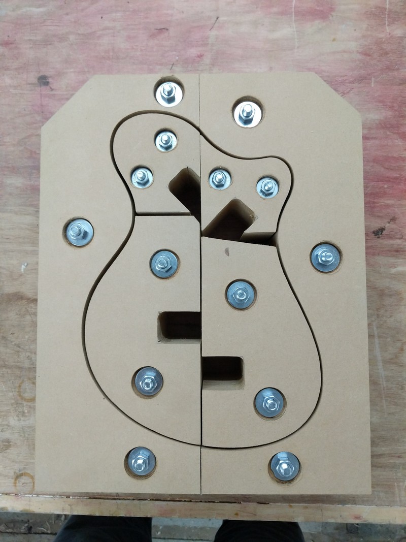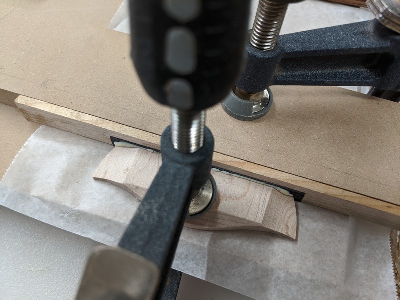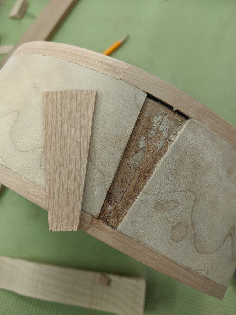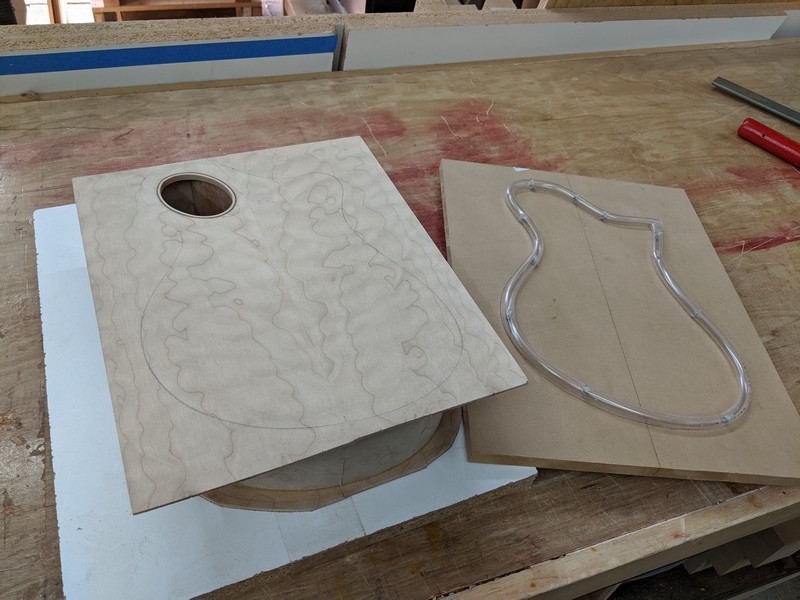 To get started, I built a set of side-bending forms for the offset body shape, and resawed top, bottom and sides from two billets of beautiful big leaf maple. The sides went into the forms, and the back was attached with some simple ladder bracing.