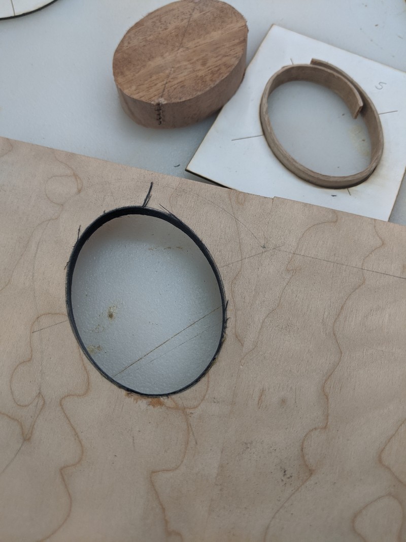 Once the body came out of the form, the top and back were trimmed, then channels cut for binding, and end graft. The binding is black veneer topped by cherry binding with a cherry end graft. The body and sound hole binding compliment each other perfectly.