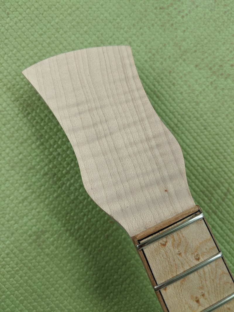 The neck presented another unique challenge because the heel does not connect to a flat surface at the top of the body. Rather, both the heel block insied the body, and the heel at the bottom of the neck are shaped to the curve of the offset body. The neck itself is made from a billet of flame maple that really compliments the quilted maple of the body. The neck profile is hand shaped, and the headstock shape is again custom designed to the preferences of the client.