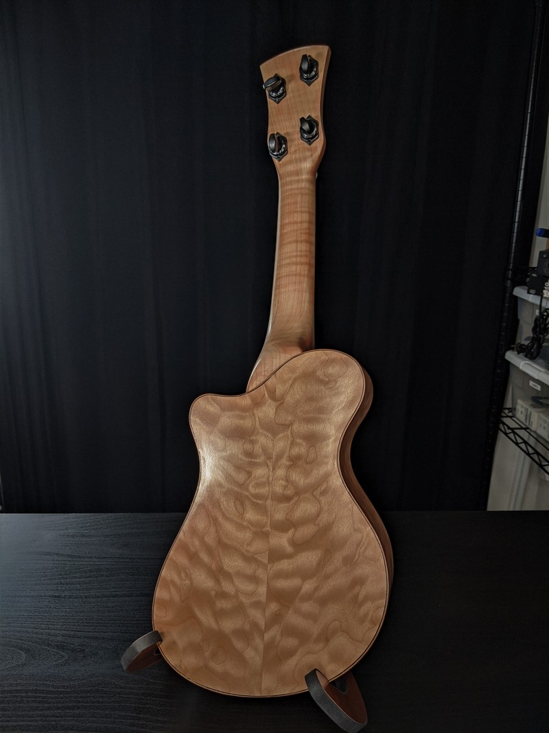 The headstock got Tune-a-lele geared post tuners from Graphtech. I don't love these tuners because they are all plastic and look a little cheap. However, they are 6:1 ratio post tuners, which you can't get anywhere else (even the Gotoh UPTs are just 4:1), and they were specifically specified by the client, so he got what he wanted. It also got a quilted maple veneer with the CalStyle logo, then got hung up for lacquer. Finally, a saddle and nut finished it off.