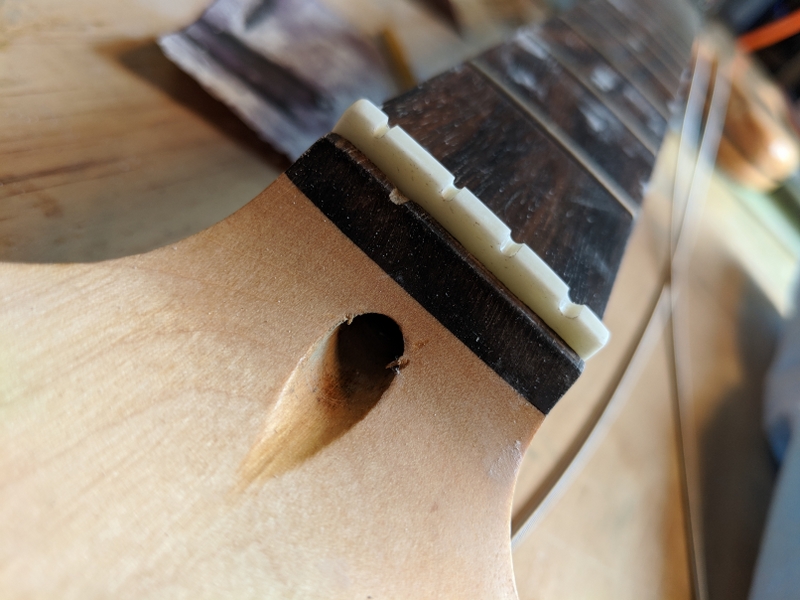 Bridge, pickups and controls went in next. I should mention that the pickups and pots are from a genuine Fender Jazz Bass. I picked them up from a bassist who was replacing his oem hardware with a custom setup. Sorry, no pics of the wiring process this time. Then a new bone nut to replace the old plastic one, and a custom Caltone logo to top it off. The tree on this logo is a California Sequoia (gotta keep the Cal connection in there somewhere!).