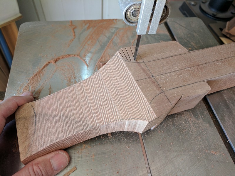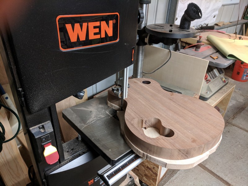 In late 2017 Steve and Josh started a project to build a custom sold-body electric for Josh, who at the time was just getting serious about the guitar. Steve was eager to try a hand-carved top and Josh wanted a traditional Les Paul style guitar anyway, so the stage was pretty well set. We picked out some nice mahogany and maple stock from our friends at Cherokee Wood Products (our favorite place to browse the hardwood racks), and some wenge as well, but as you'll see later, that went by the wayside. And of course, as any good build does, this one started with templates, rough cuts and glue-ups of the major components.