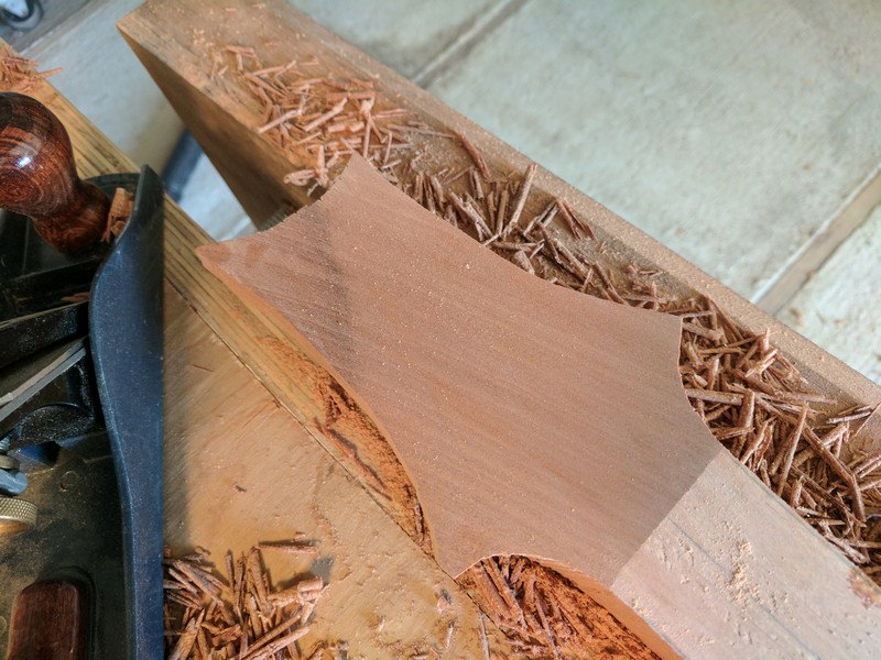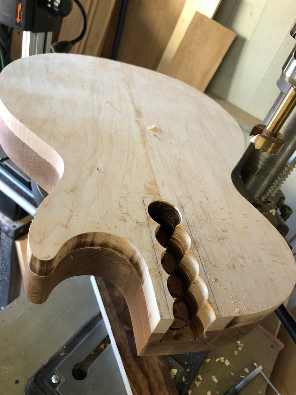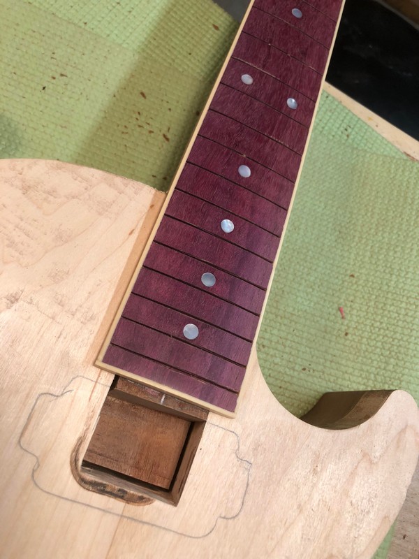 It's not quite time to glue the neck in, but before starting the body carve, I needed to get the neck and pickup cavities cut. Since the neck joins to the body at an angle, there were some routing and planing gymnastics involved.
