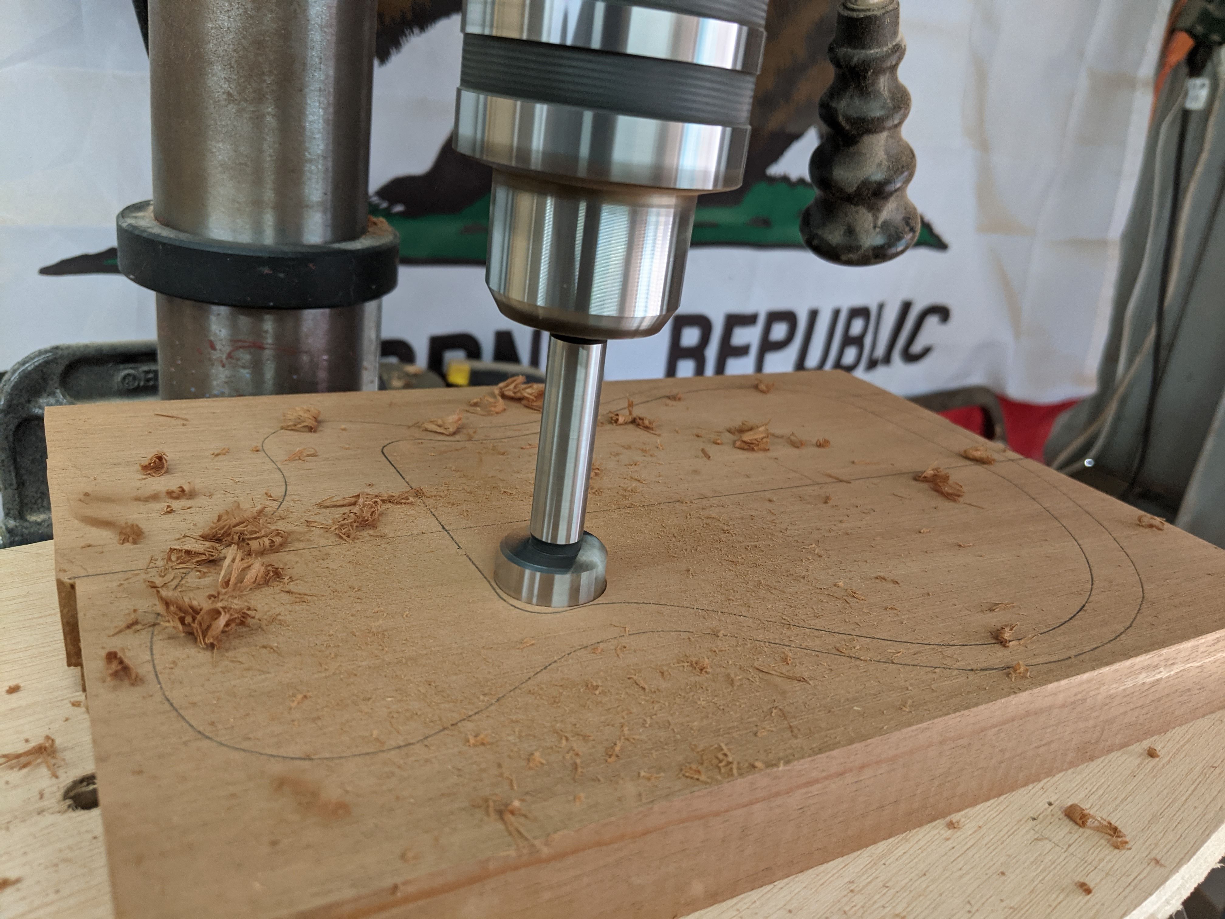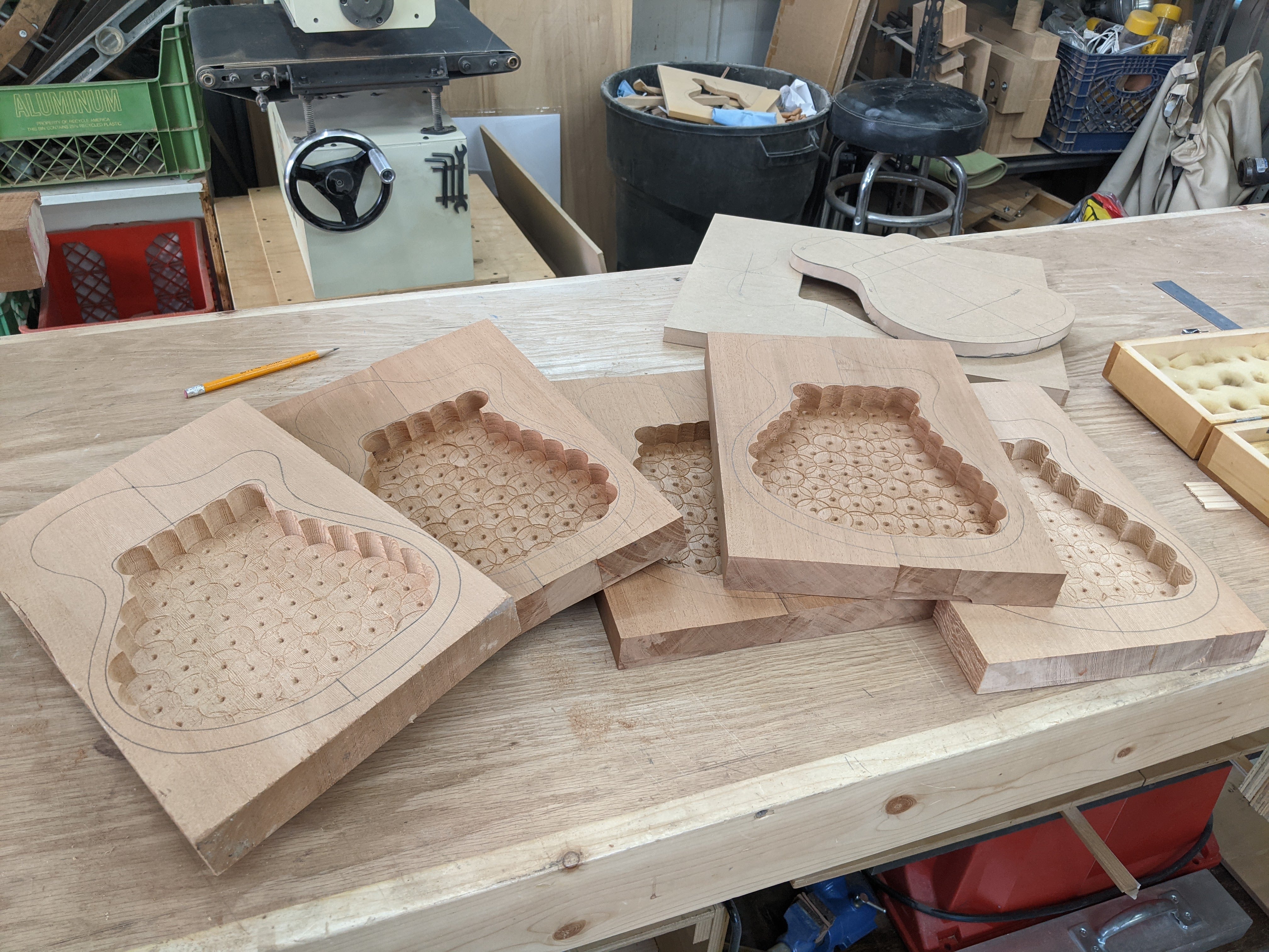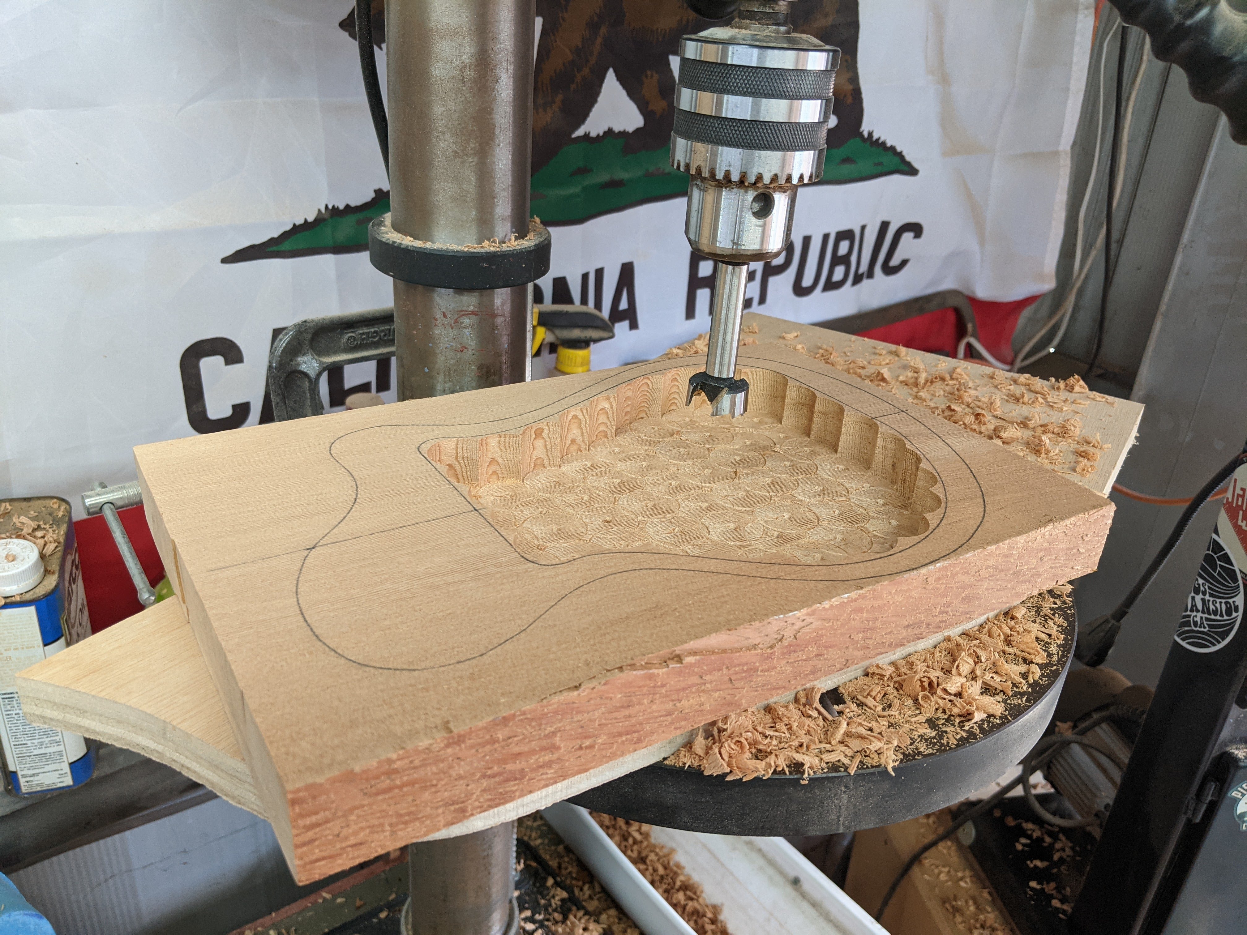 So this build started with five billets of African mahogany and spruce. I started hollowing the body by hogging out the bulkk of the material with a forstner bit in the drill press, then cleaned it up, and took it down to final thickness with the router.