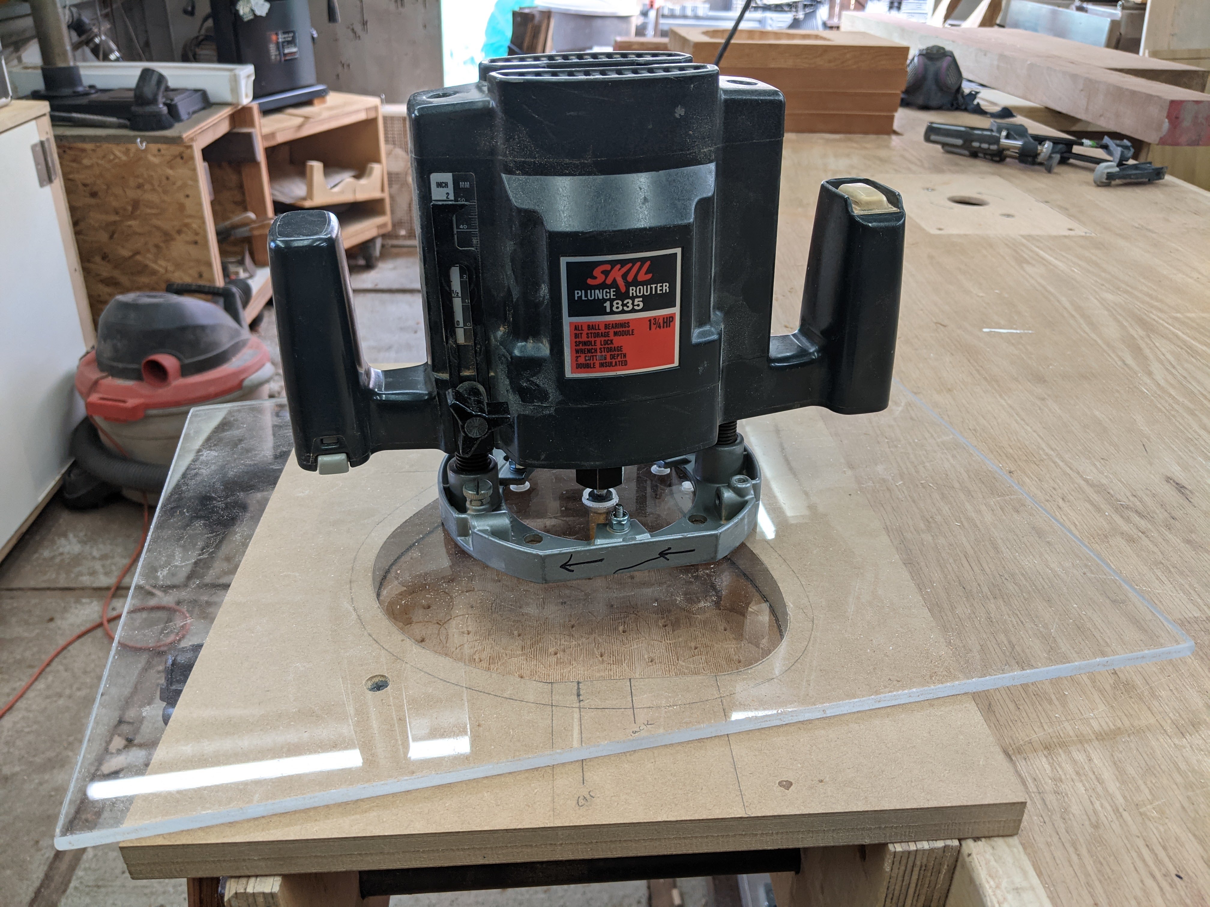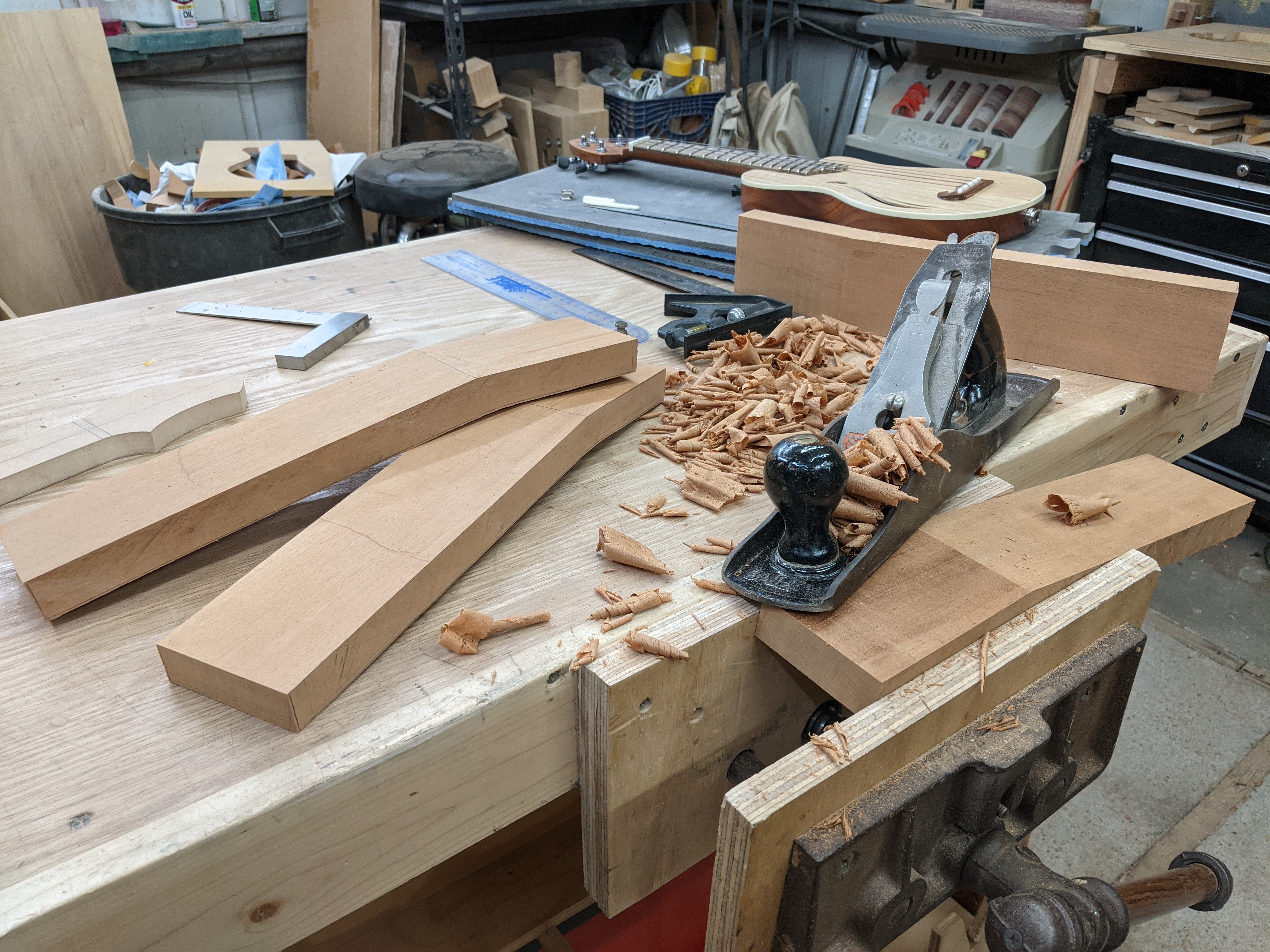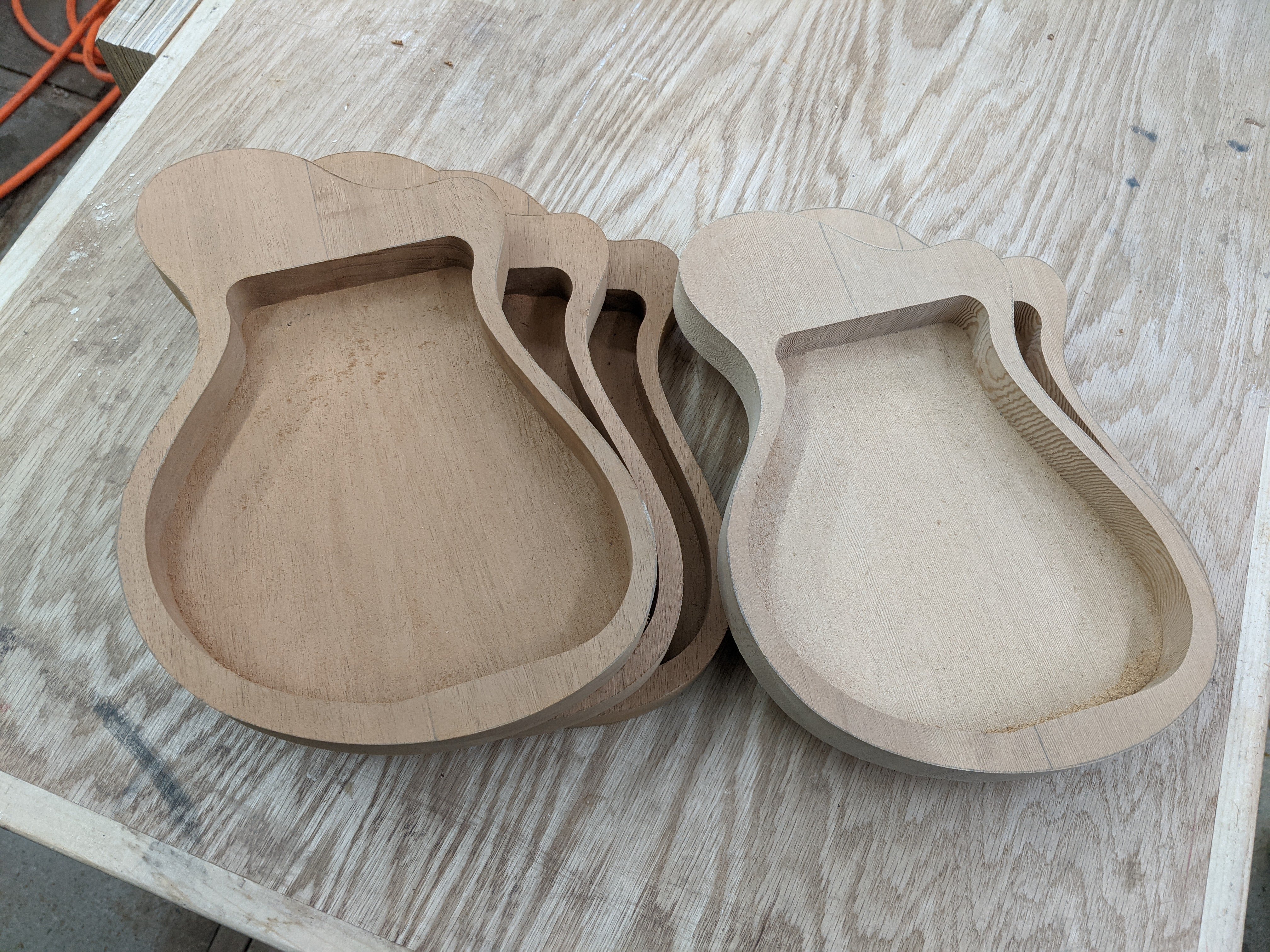 So this build started with five billets of African mahogany and spruce. I started hollowing the body by hogging out the bulkk of the material with a forstner bit in the drill press, then cleaned it up, and took it down to final thickness with the router.
