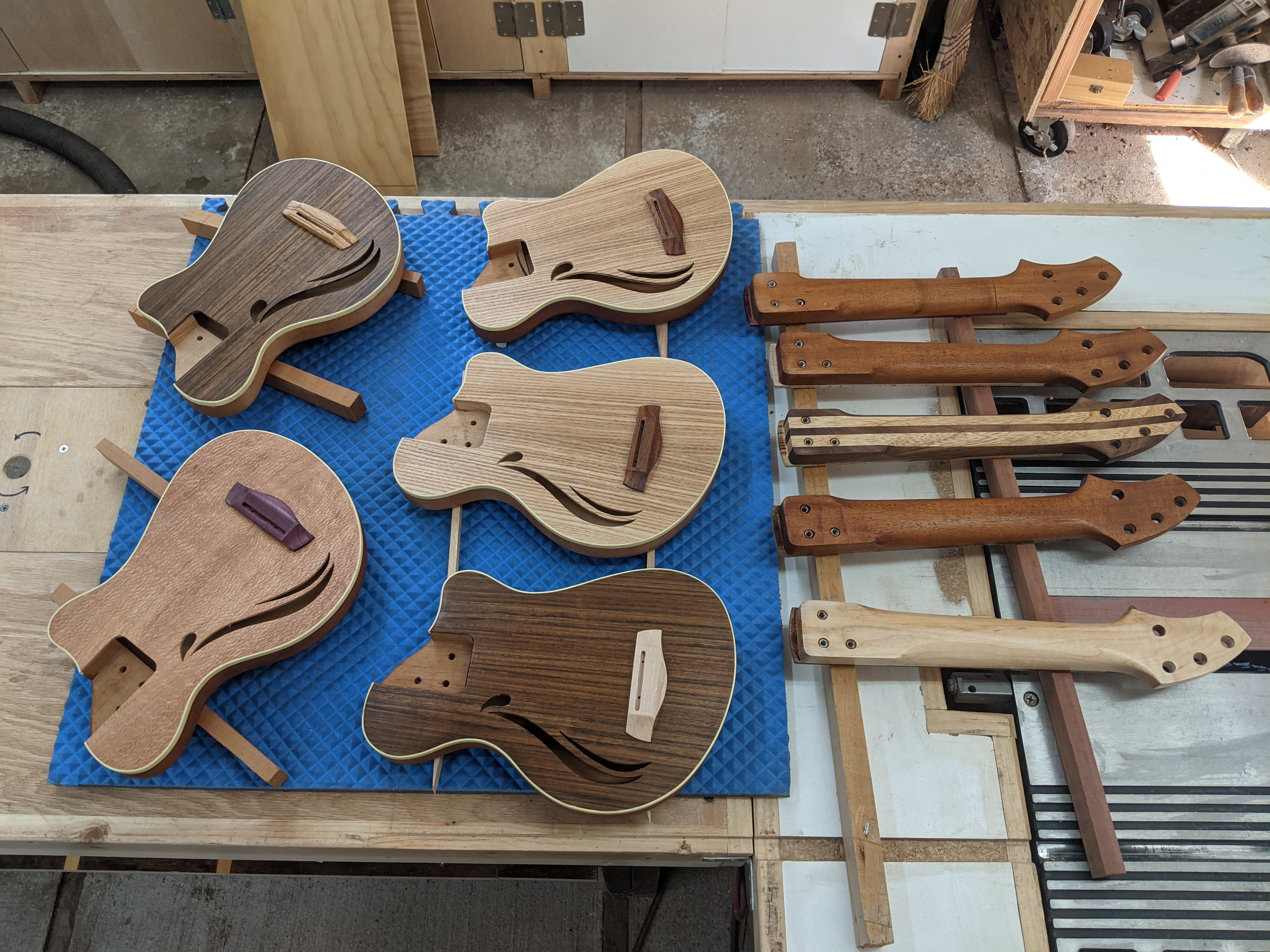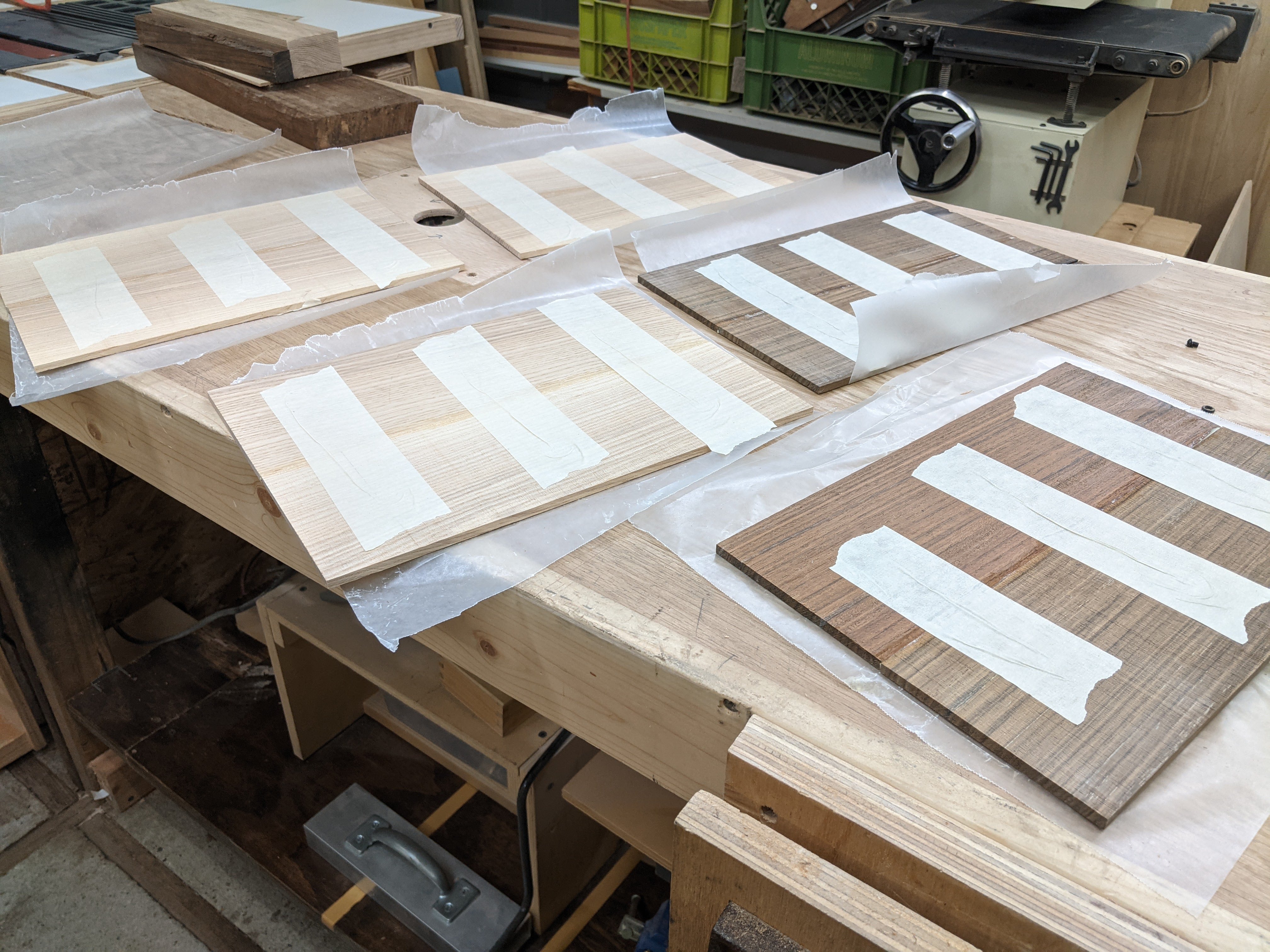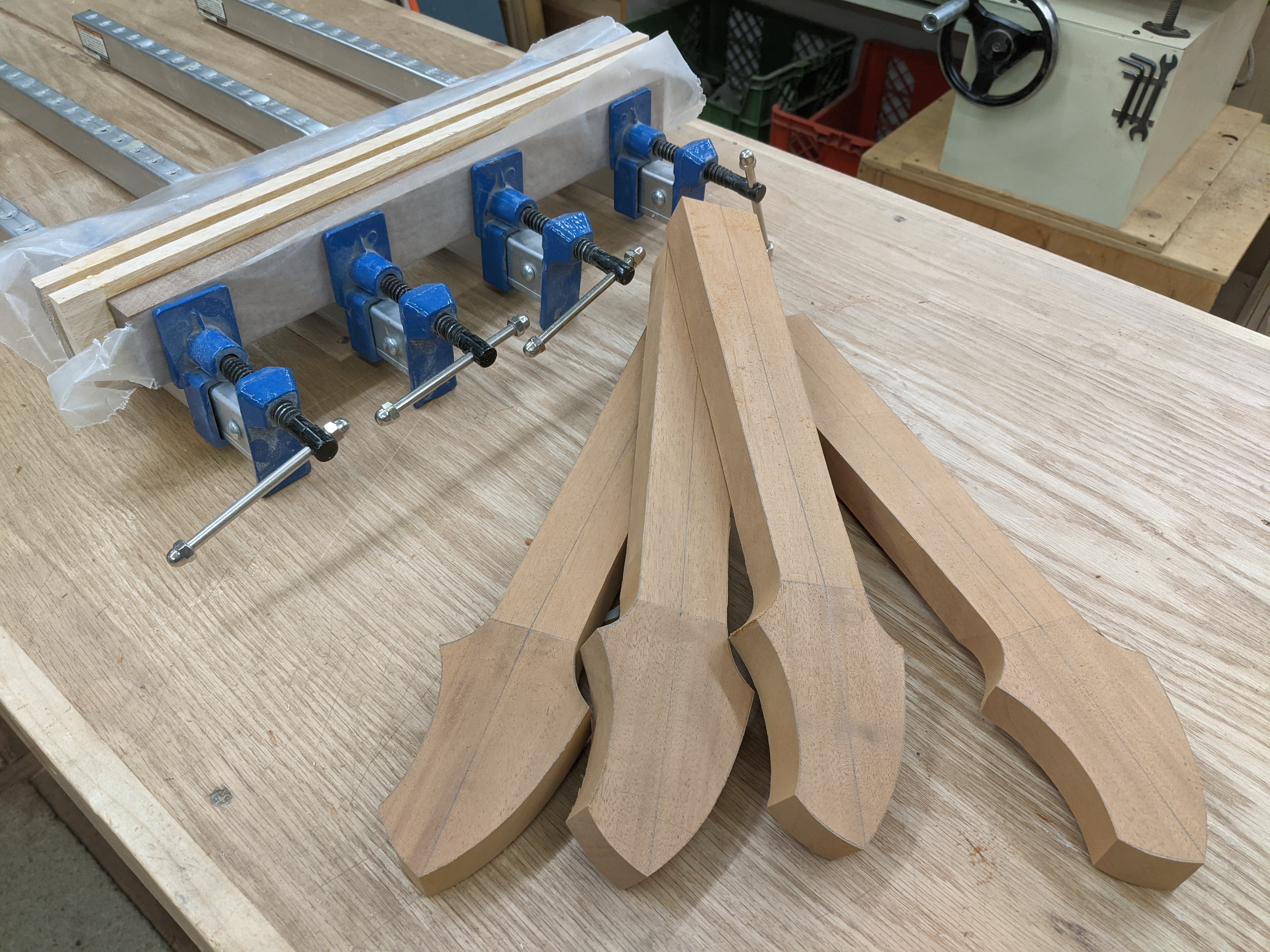 Next, I resawed, glued up, and cut out the tops. There are two ash tops, two shedua, and one silky oak.