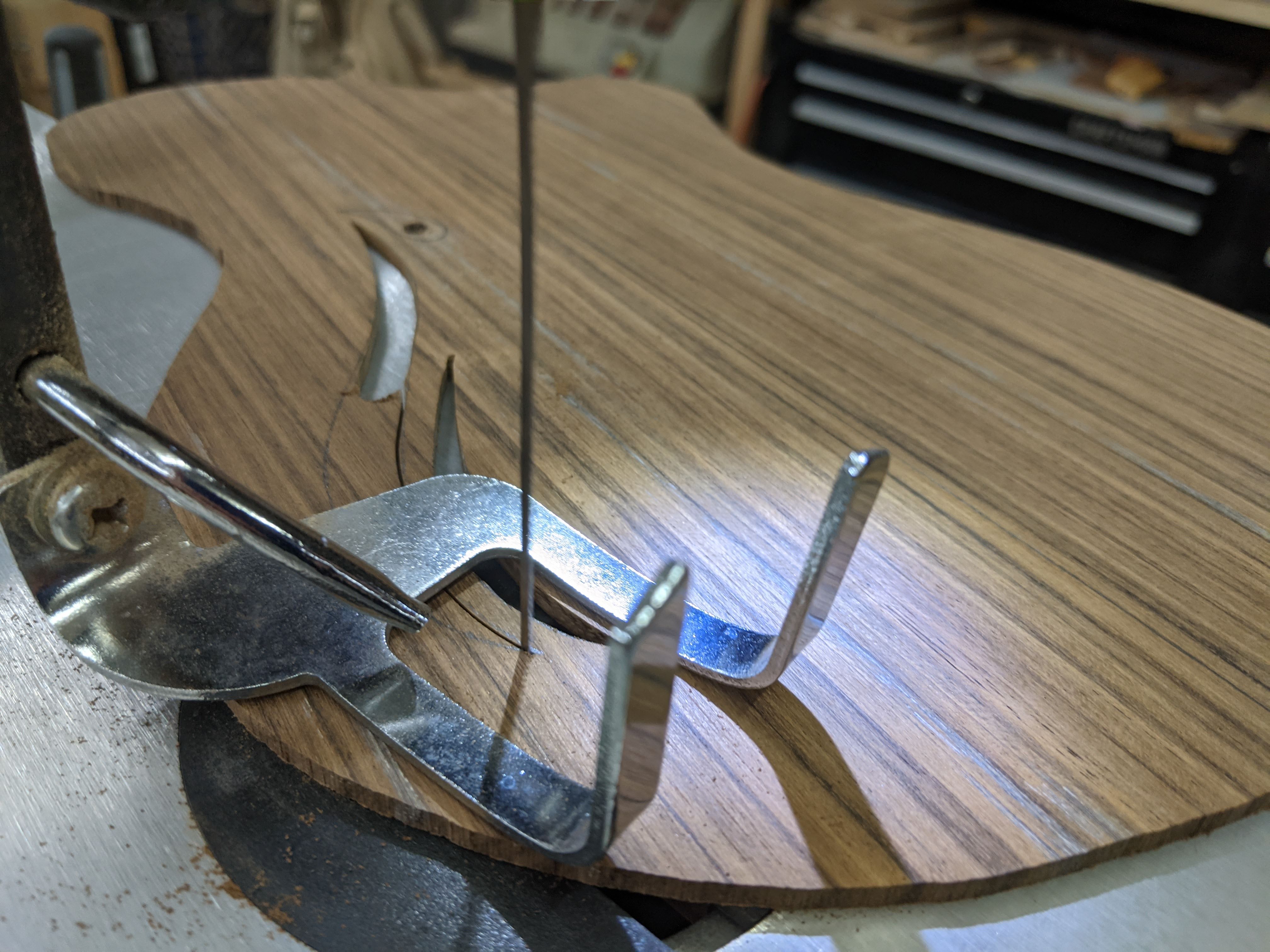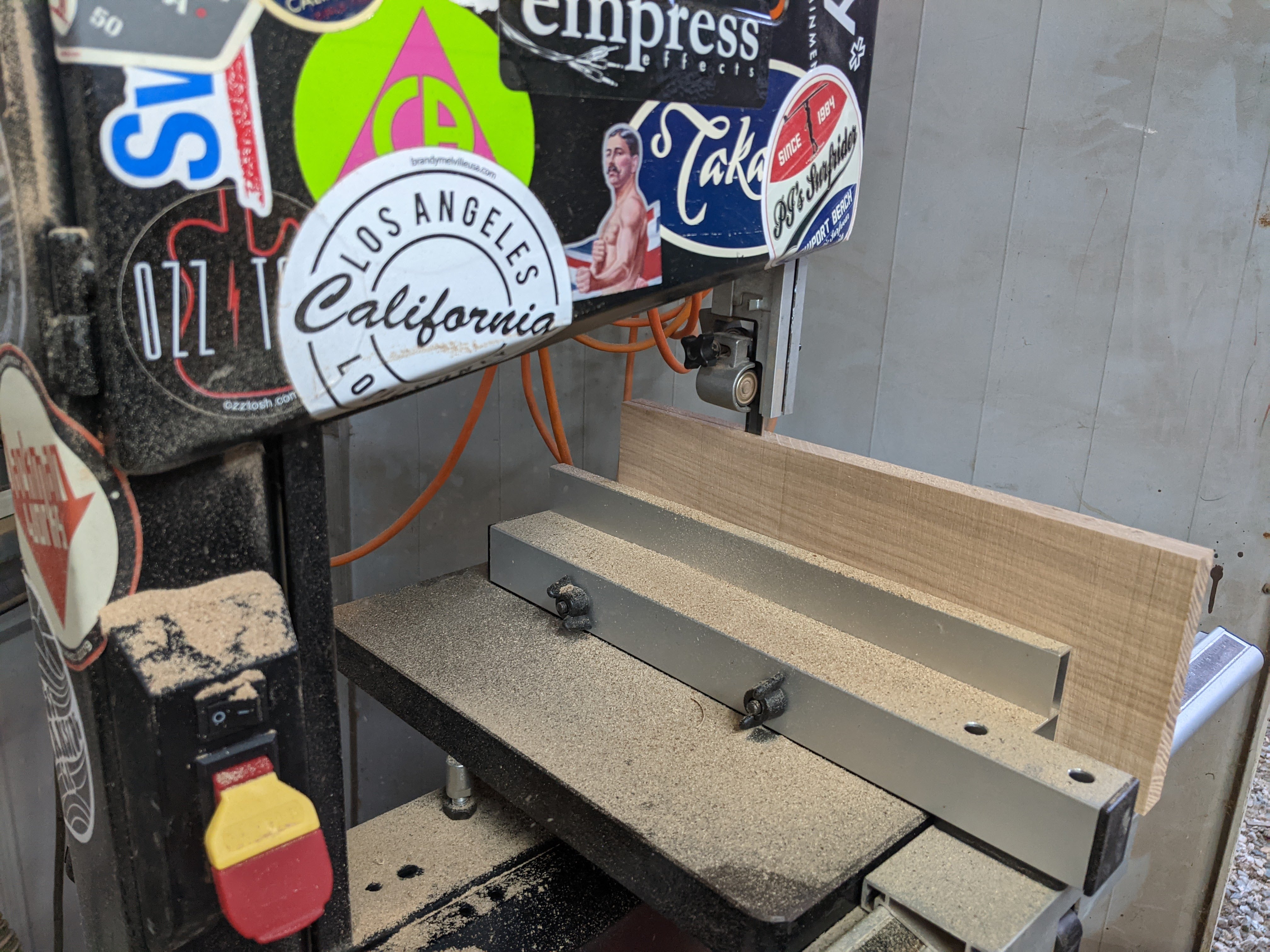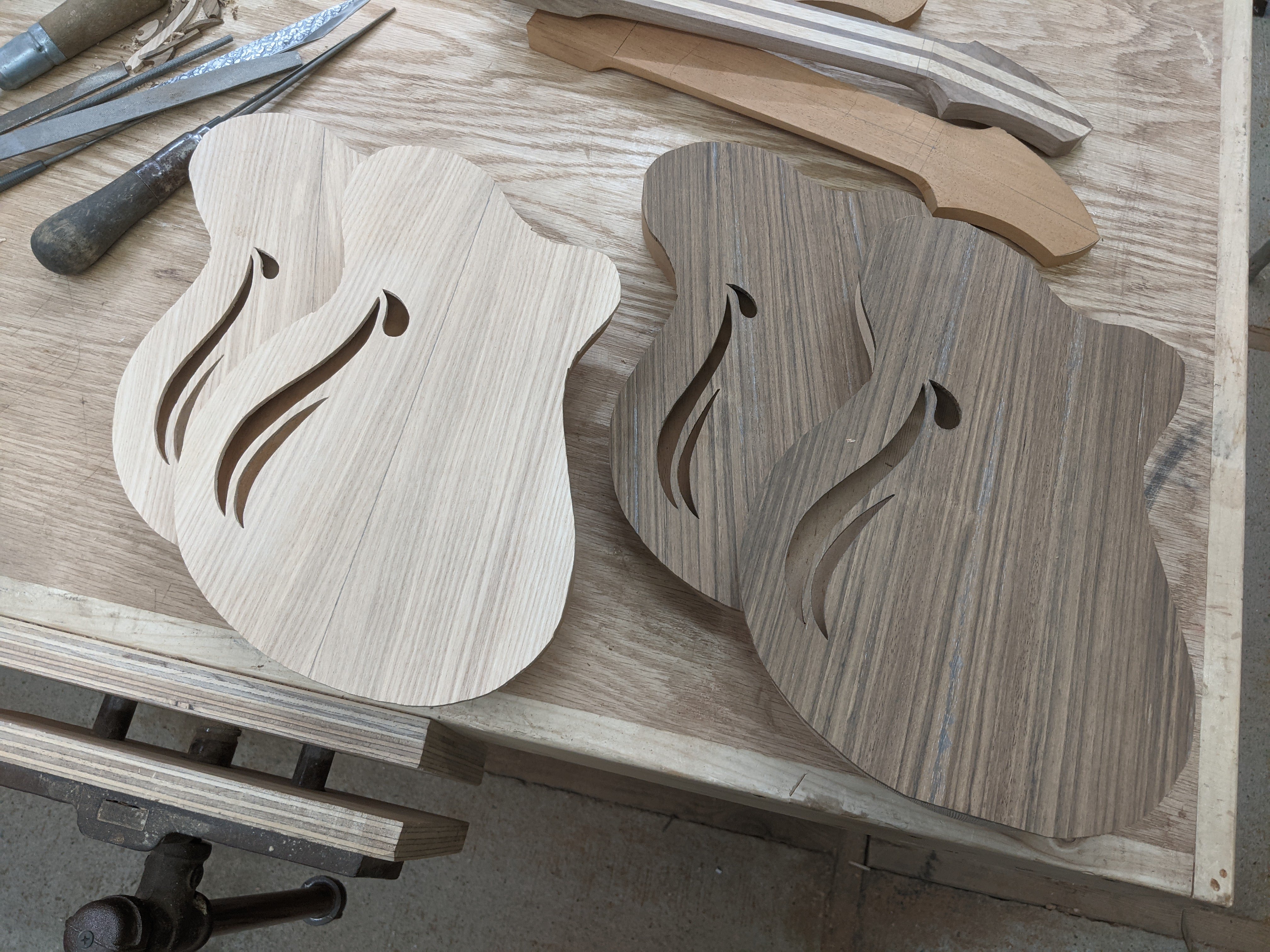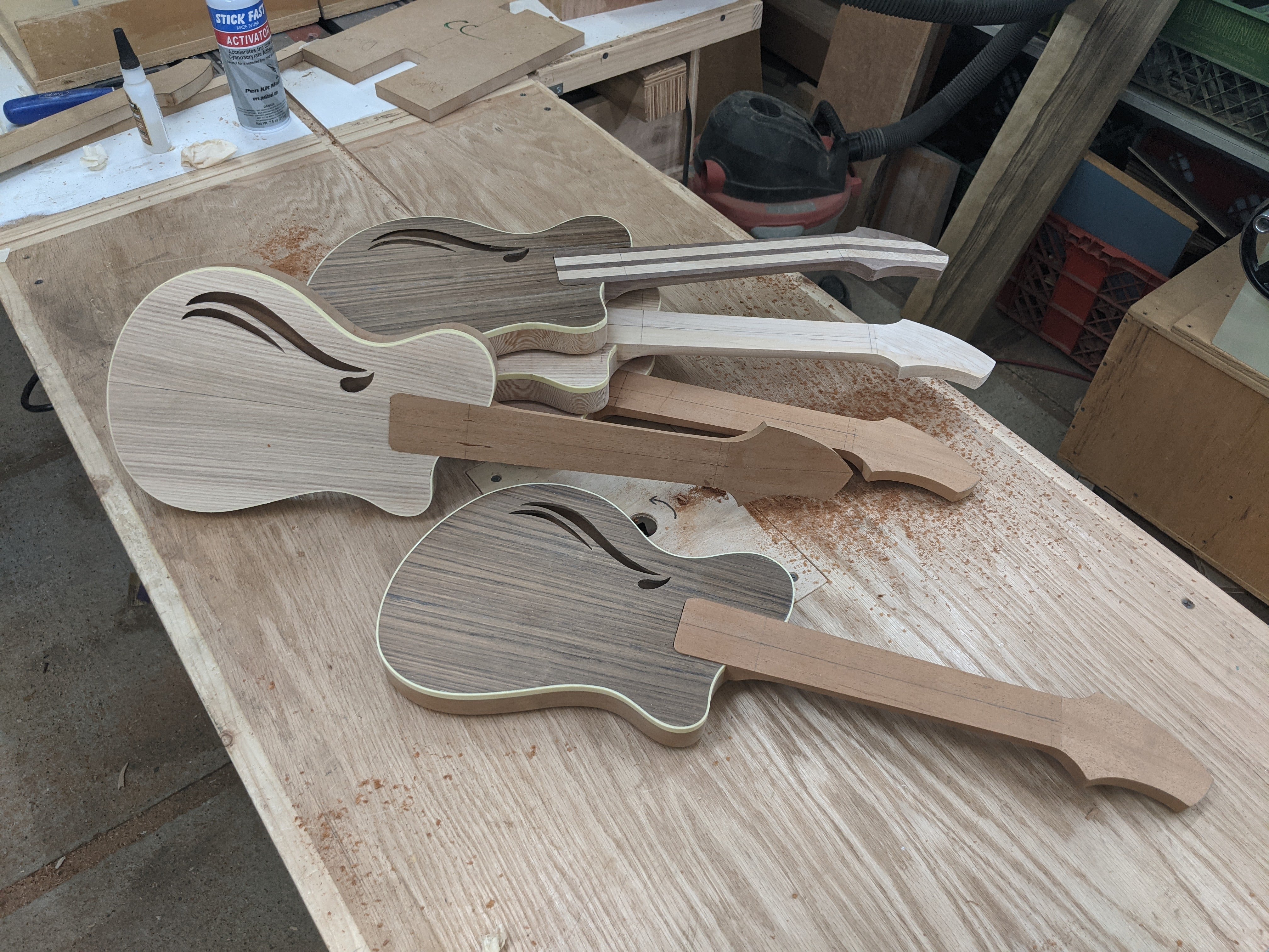 Next, I resawed, glued up, and cut out the tops. There are two ash tops, two shedua, and one silky oak.