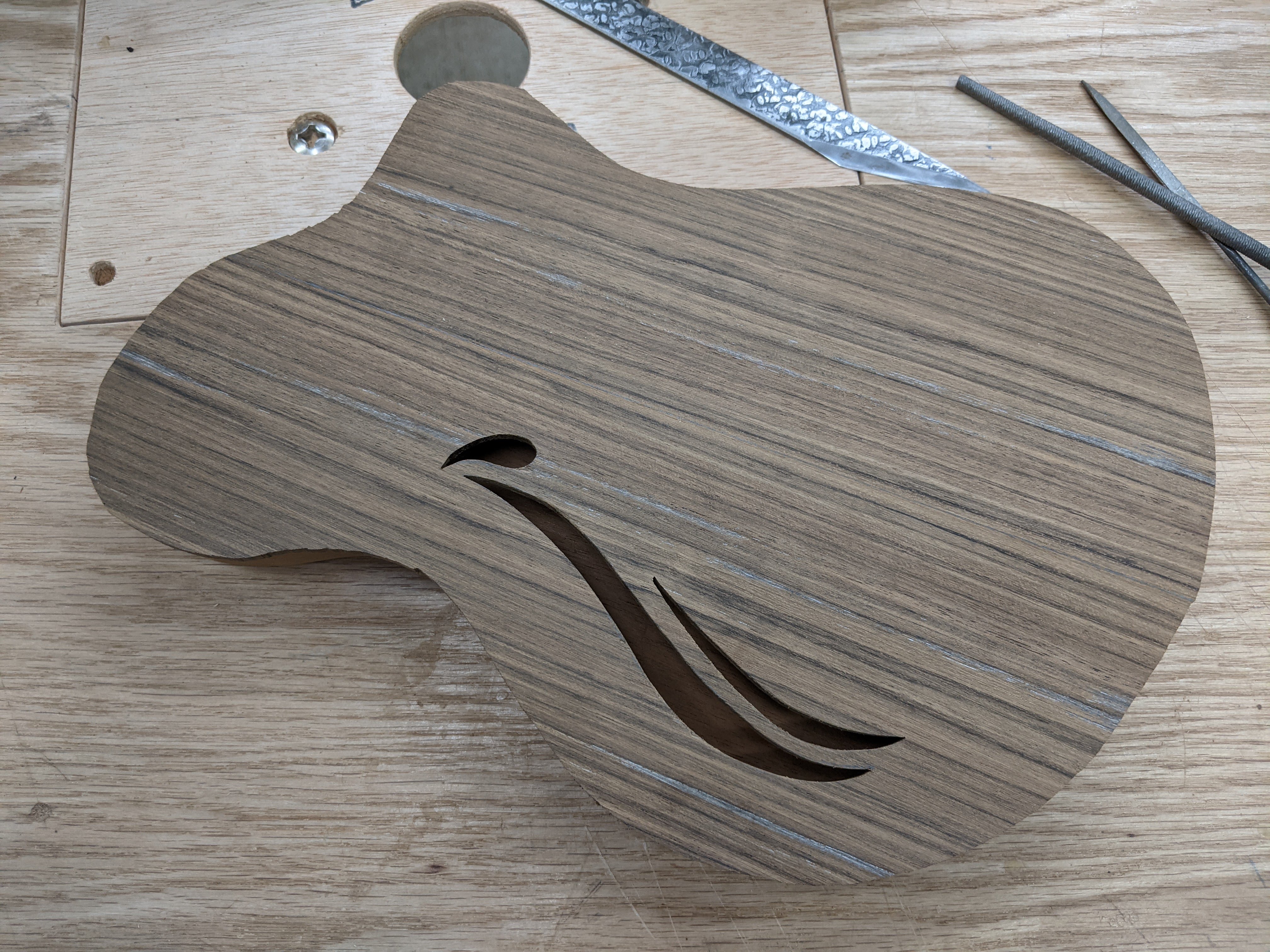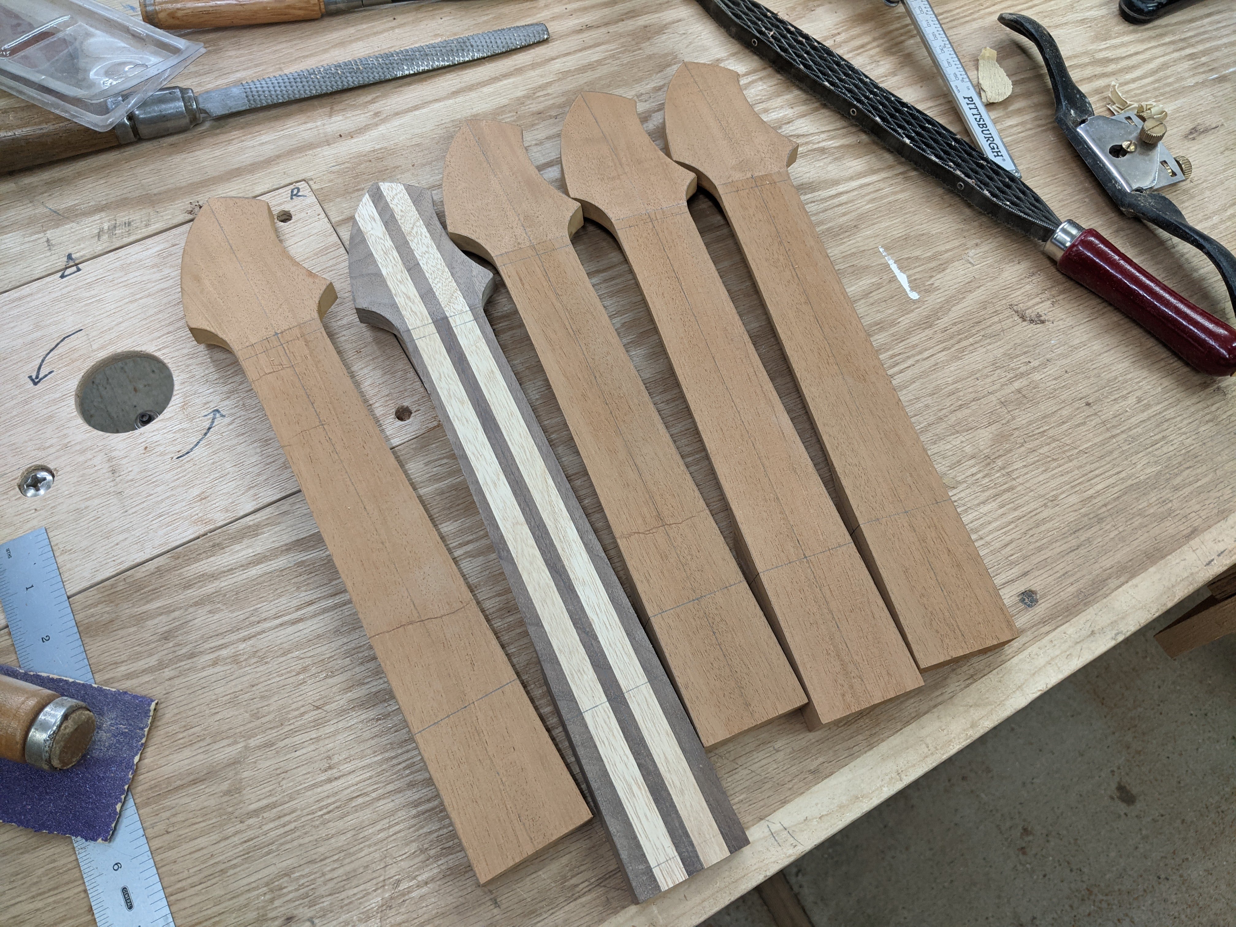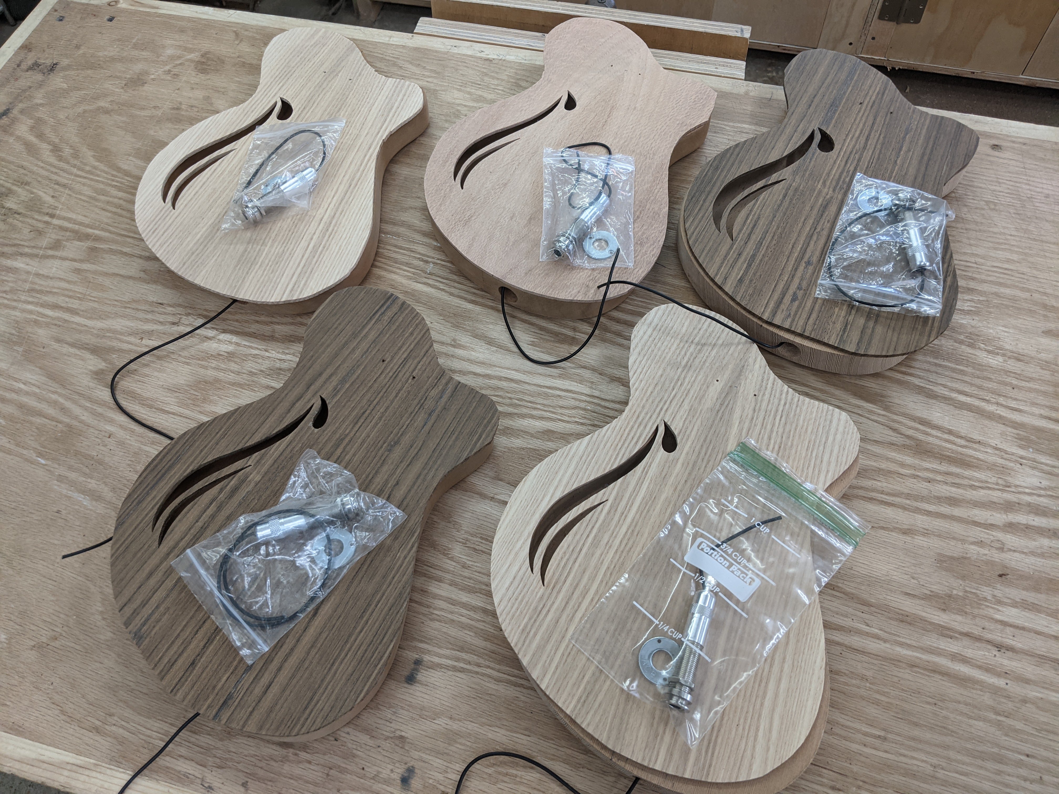 Four of the instruments got mahogany necks, and one got a maple and walnut multipiece neck, all bolt-ons with hand-shaped back plates. I ended up not loving the back plates, and future versions of these instruments got screw ferrules for the neck attachments, which look much better in my opinion. Each body got a barrel jack connected to disc-style piezo pickups which were attached to the underside of the top with adhesive.