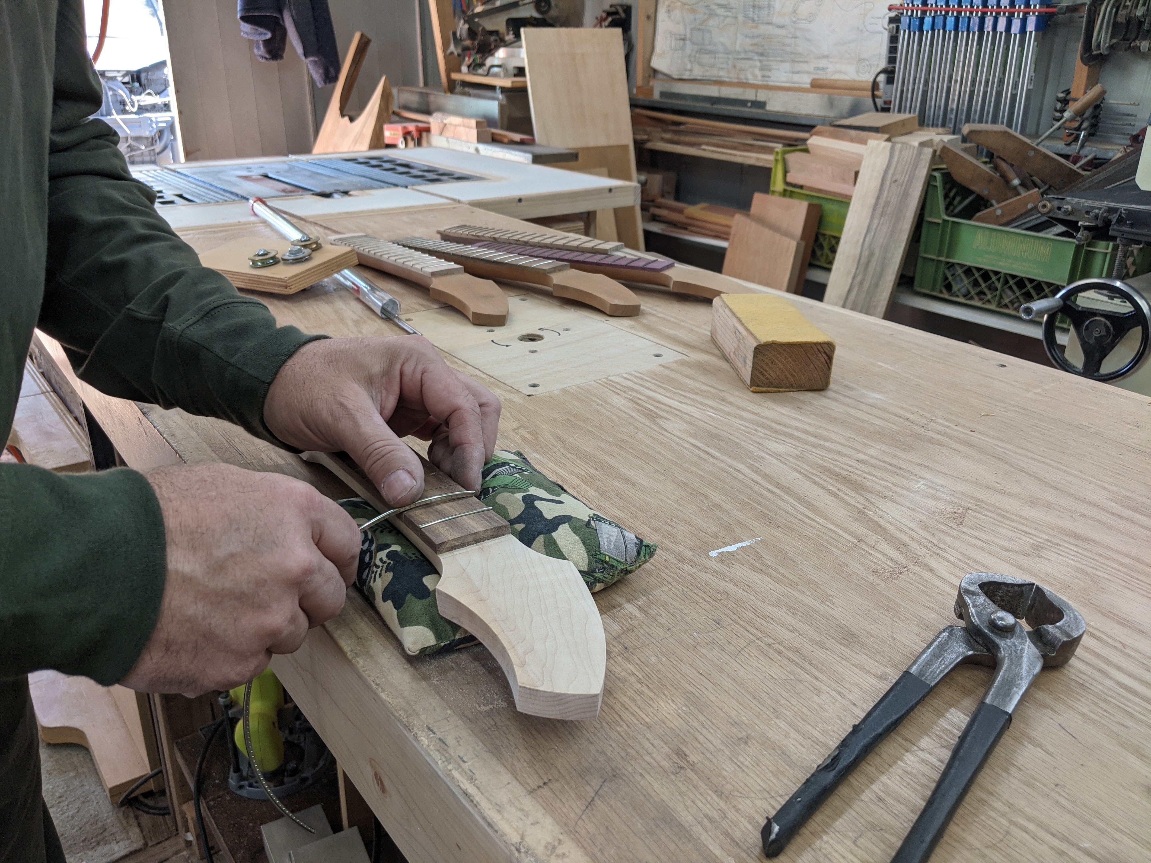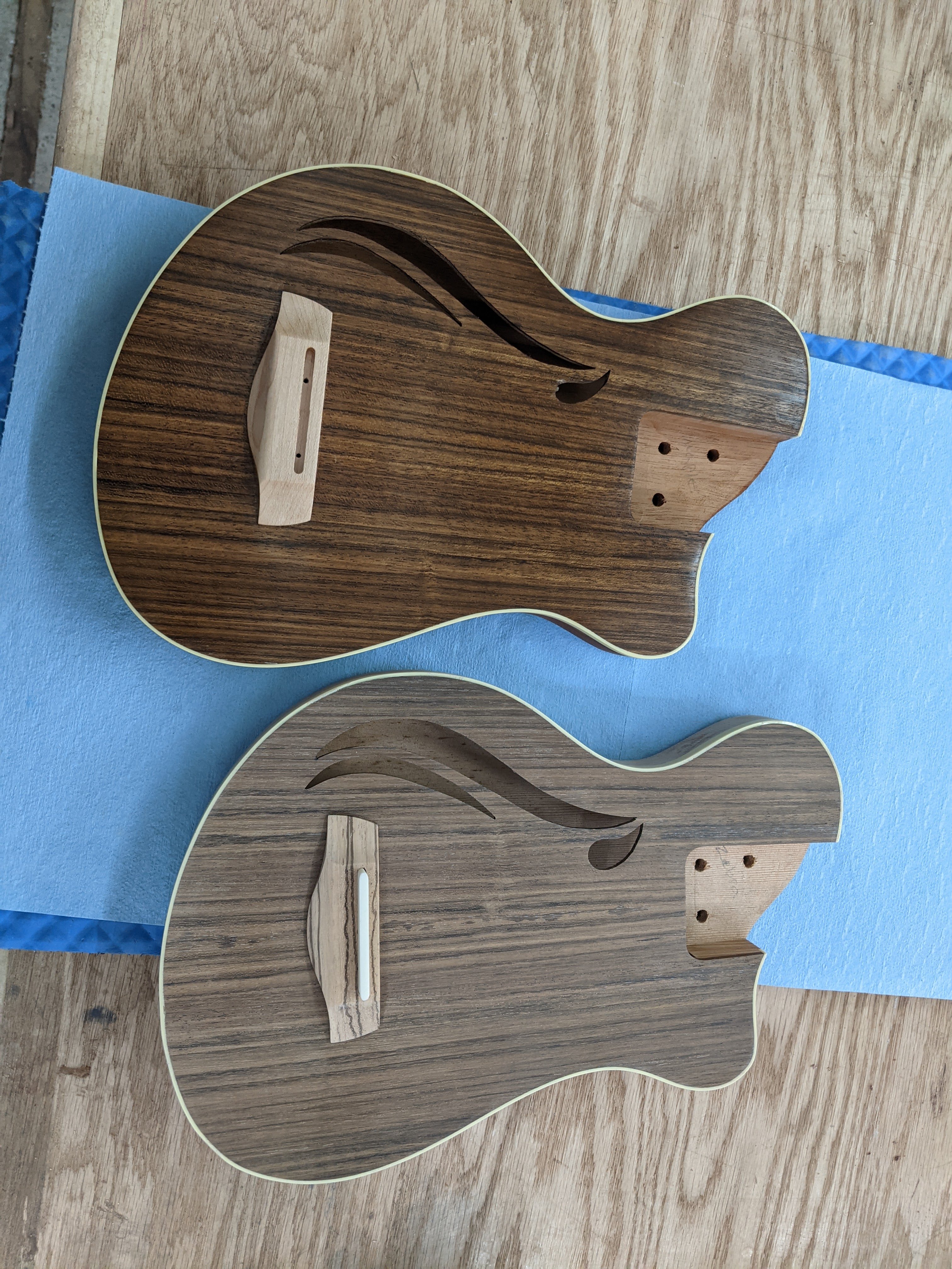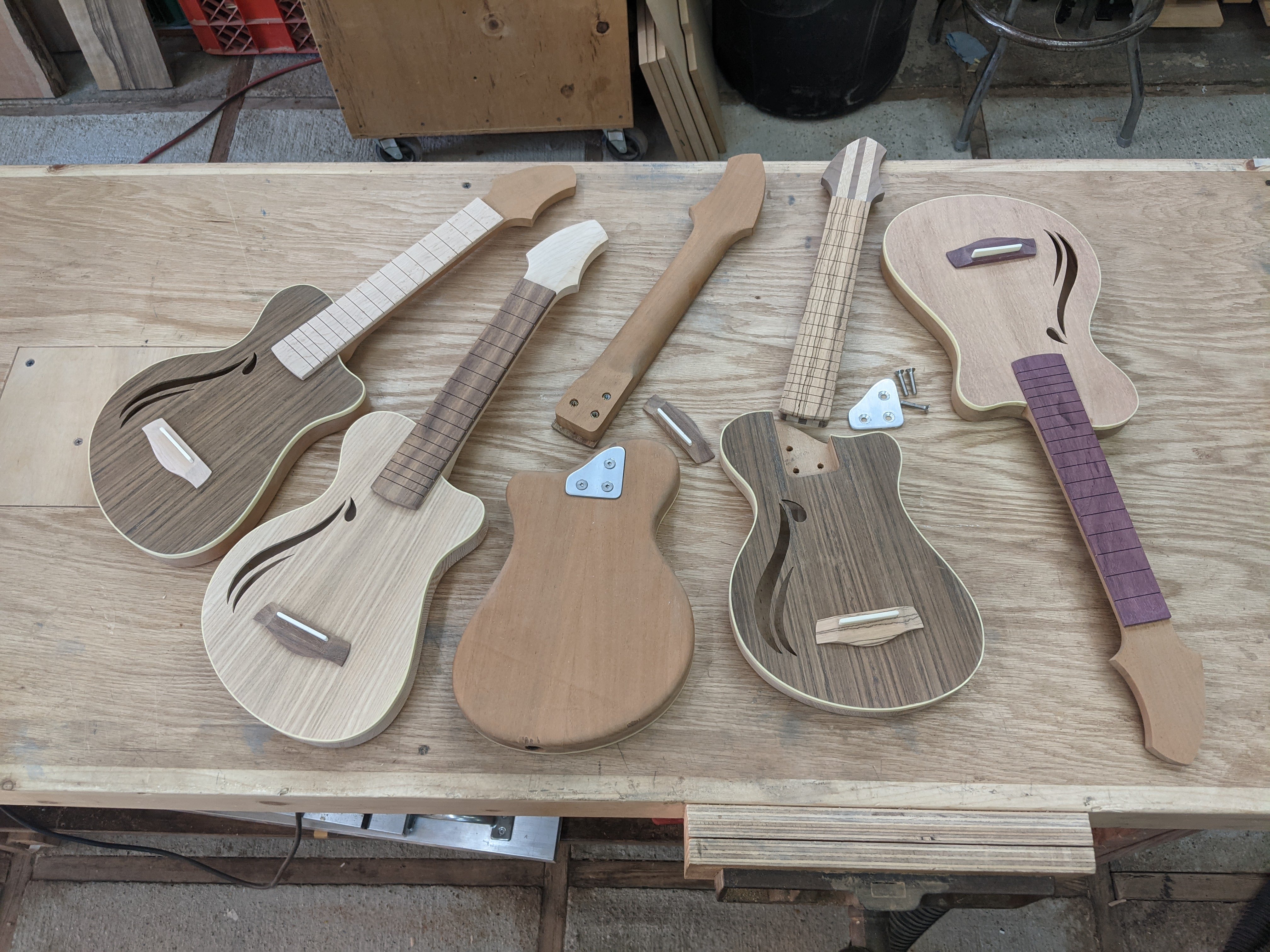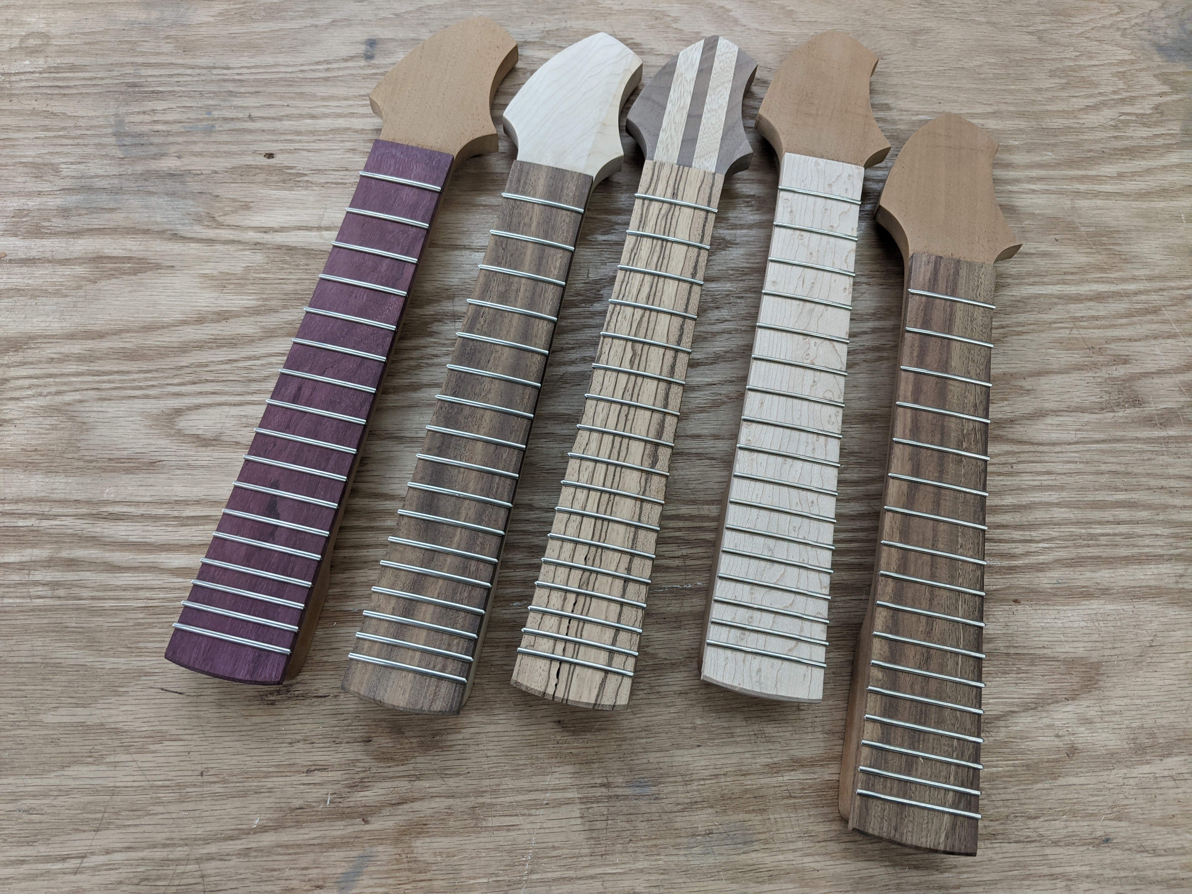 Next up - fretboards and frets. There's one purpleheart fretboard, one birdseye maple, two North Indian rosewood, and one zebra. Each instrument got a bridge from the same wood as its fretboard, and an oil finish that really brings out the natural beauty of the wood.